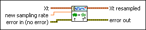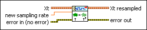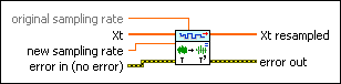 Resamples the equally- or unequally-sampled time series into a new time series with a specified time interval using the interpolation method. Wire data to the Xt input to determine the polymorphic instance to use or manually select the instance.