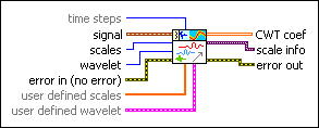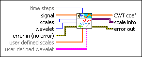 user defined scales specifies the scales to use to compute CWT coef. The scale must be positive and no greater than the length of signal. If you specify a value for user defined scales, this VI ignores the settings in the scales input. | ||||||