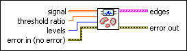 threshold ratio specifies the relative threshold to use to reject small peaks. threshold ratio is defined in the range [0, 1], where 0 and 1 correspond to the minimum and maximum values of the coefficients, respectively. The smaller the value of threshold ratio, the more edges this VI detects. | ||