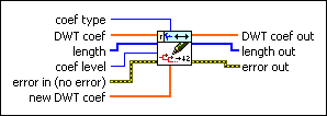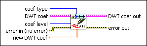 Sets approximation or detail discrete wavelet transform (DWT) coefficients at a specific level. Use the WA Discrete Wavelet Transform VI to compute the DWT. Use the WA Get Coefficients of Discrete Wavelet Transform VI to obtain the DWT coefficients.WA Set Coefficients of 1D Discrete Wavelet Transform (Waveform)