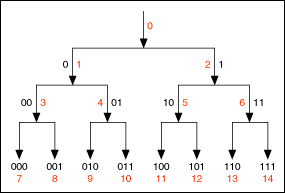 The black numbers indicate the path of each node, and the red numbers show the index of each node. The path is a combination of the characters 0 and 1, where 0 represents lowpass filtering, and 1 represents highpass filtering. For example, a value of 101 indicates that this VI passes the signal through a highpass filter, through a lowpass filter, and then through a highpass filter.