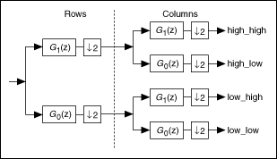 The following figure shows the PR filter bank implementation of the 2D DWT, which applies the filter banks to both rows and columns of an image: