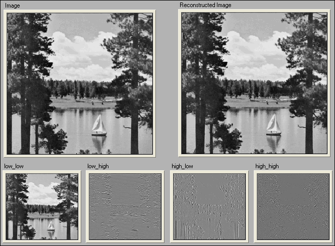 The following figure shows an example of decomposing and reconstructing an image file with the 2D DWT and the inverse 2D DWT: