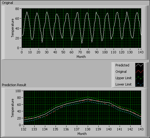 The Prediction Result graph in the previous figure compares the predicted temperatures with the original temperatures of the twelfth year by plotting them together. The prediction may bias from the true values but the true values fall into the estimated confidence range. The Upper Limit and Lower Limit plots in the Prediction Result graph indicate the confidence range of the prediction. You can see in the Confidence Level indicator that the prediction result falls into the estimated confidence range with the confidence level of 99.73% (3σ).