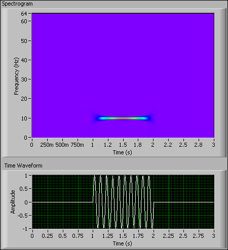 The following figure shows the STFT spectrogram of a test signal that contains ten sine cycles at 10 Hz. This example uses a Hanning window.