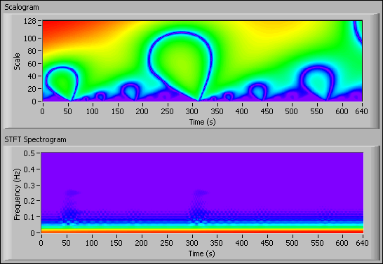 You also can compute the squares of the CWT coefficients and form a scalogram, which is analogous to the spectrogram in time-frequency analysis. In signal processing, scalograms are useful in pattern-matching applications and discontinuity detections. If a signal contains different scale characteristics over time, the scalogram can present a time-scale view of the signal, which is more useful than the time-frequency view of that signal. Use the WA Configure Scalogram Indicator VI to display the scalogram on an intensity graph.