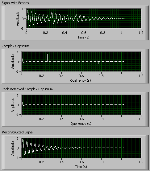 - Compute the complex cepstrum of the original time series using the TSA Complex Cepstrum VI. The peaks appearing in the Complex Cepstrum graph indicate the echo locations.
