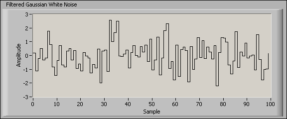 The theoretical crest factor Cf for a Gaussian is infinite, but clipping the Gaussian amplitude to the input signal limit reduces the crest factor. Clipping the Gaussian amplitude minimally affects the generated spectrum. You can use the Gaussian White Noise VI to generate Gaussian white noise. You then can use the Filters VIs to generate Filtered Gaussian white noise from Gaussian white noise.