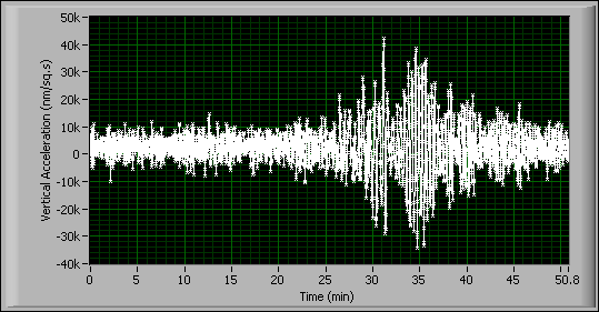 Given a continuous time series, you can digitize the values at a specified time interval to obtain a discrete time series. The following figure shows the seismograph of the Kobe earthquake, recorded at Tasmania University, Hobart, Australia on January 16, 1995. In this figure, the continuous earthquake vibration signal is sampled at a one-second interval to form a discrete time series.
