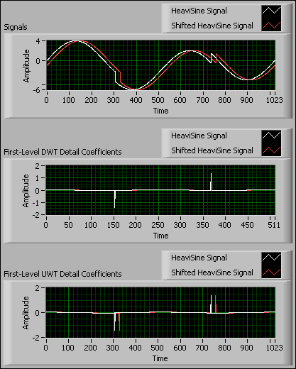 You can use the first-level detail coefficients of either the DWT or the UWT to detect the discontinuities in the HeaviSine signal by locating the peaks in the coefficients. However, if the HeaviSine signal is shifted by 21 samples, all of the first-level DWT detail coefficients become very small. Therefore, you cannot use the first-level DWT detail coefficients to detect the discontinuities in the shifted HeaviSine signal. Because of the translation-invariant property of the UWT, you can use the first-level UWT detail coefficients to detect the discontinuities of the shifted HeaviSine Signal. The first-level UWT detail coefficients of the shifted HeaviSine Signal are simply the shifted version of the first-level UWT detail coefficients of the original HeaviSine signal.