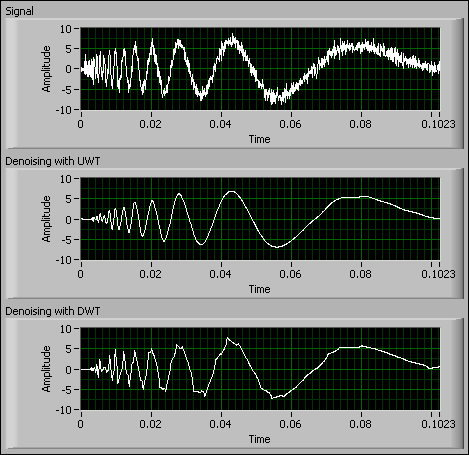 Use the Wavelet Denoise Express VI or the WA Denoise VI to reduce noise in 1D signals with both the UWT-based and DWT-based methods. The UWT-based method supports both real and complex signals. The DWT-based method supports only real signals. You also can use the WA Denoise VI to reduce noise in 2D signals with the UWT-based method.