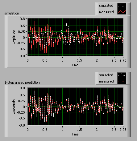 You can use the SI Model Simulation VI and SI Model Prediction VI to determine the accuracy of the estimated model. The SI Model Simulation VI simulates the system model and the SI Model Prediction VI performs a prediction of the system model. The results of the SI Model Prediction VI might differ from the SI Model Simulation VI because the SI Model Prediction VI periodically makes corrections to the estimated response based on the actual response of the system.