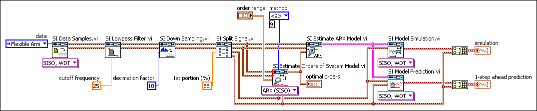 The following figure shows how you use these VIs to verify the ARX model created in the User-Defined Criterion section: