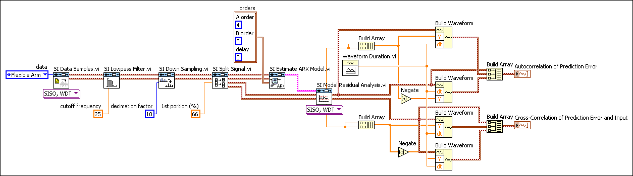 The following block diagram shows how you can use the SI Model Residual Analysis VI with the ARX model identified in the User-Defined Criterion section to analyze the residuals: