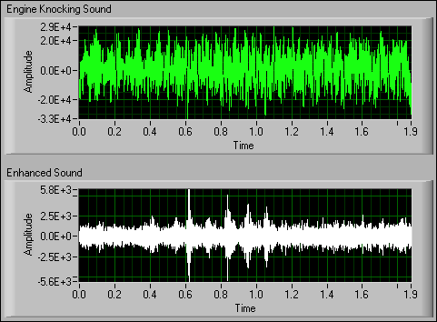 This example applies the bior3_7 wavelet and the path 11 to the decomposition of the signal that the Engine Knocking Sound graph contains. The Enhanced Sound graph shows the signal reconstructed from the path 11. The high-amplitude components around 0.6, 0.8, and 1.0 in the Enhanced Sound graph indicate where the ignition malfunction of the engine occurs.