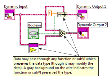 LabVIEW class wires that do not originate at a dynamic input have no background wire color. The background color of the wire is gray for any wire that originates at a dynamic input and does not pass through any functions that can change the run-time data type. A red background indicates multiple sources for the data on the wire, one of which is the dynamic input terminal.