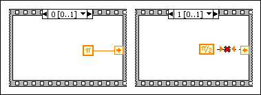 Sequence local has sources on separate frames. You can assign a value to the sequence local terminal of a Stacked Sequence structure in only one frame, but you can use the value in all subsequent frames. On the left side of the following example, the value pi is assigned to the sequence local terminal in frame 0. If you try to assign another value to this same sequence local terminal in frame 1, you create a broken wire, as shown on the right side of the example.