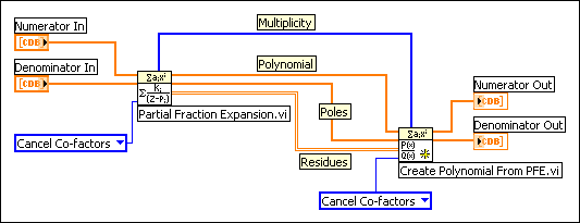 The following block diagram shows how to use the Create Polynomial From PFE VI to reconstruct a rational polynomial from the Partial Fraction Expansion VI.