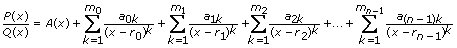 where P(x) is Numerator, Q(x) is Denominator, A(x) is Polynomial, n is the number of elements in Poles, ri is the ith element in Poles, mi is the ith element in Multiplicity, and aik is the (i, k)th element in Residues.