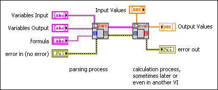 The first two categories of Formula Parsing VIs can be further divided into two subcategories, the direct form and the indirect form. As an example, the direct version of the Eval Formula Node VI is represented by the following block diagram.