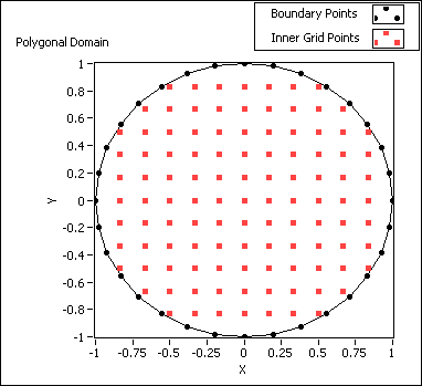 The following illustration shows the unit circle on a polygonal domain. The black circle points are the points on the boundary of the domain that generate evenly on the unit circle. The red square points are the inner grid points that generate automatically with the default of grid factor.