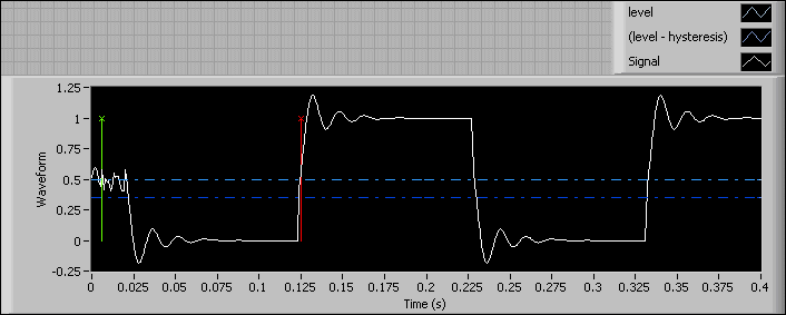 In the previous graph, the white line is the input signal. If the level is 0.5, and the hysteresis is 0.0, LabVIEW returns the green line that represents the false trigger caused by the noise. If the hysteresis is 0.15, LabVIEW returns the red line at approximately 0.125s that represents the valid trigger.