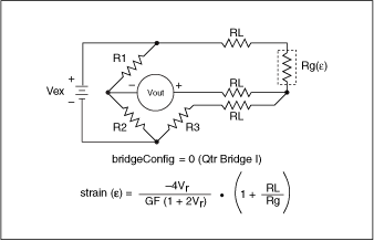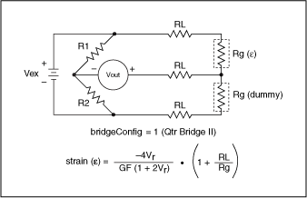In the circuit diagrams, VOUT is the voltage you measure and pass to the conversion VI as the Vsg. In the quarter-bridge and half-bridge configurations, R1 and R2 are dummy resistors that are not directly incorporated into the conversion formula.