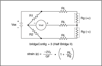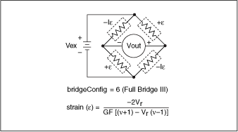 The conversion formula the VI uses is based solely on the bridge configuration. The following illustrations show the seven bridge configurations you can use and the corresponding formulas. For all bridge configurations, the VI uses the following formula to obtain Vr.