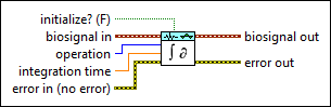 integration time specifies the duration, in seconds, of one segment to perform integration. This VI initializes the integration at the start of each segment. The default is -1, which means this VI performs continuous integration of the input signal. integration time is valid only when operation is Integral. | ||||