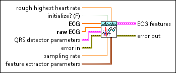 Detects QRS waves and extracts features from electrocardiogram (ECG) signals. This VI can process signals online. This VI needs signals of a complete heart beat cycle to extract features. The ECG features output might delay from the input signal, according to the input block size.