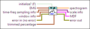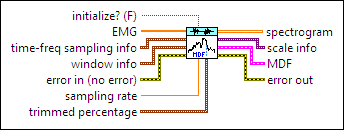Calculates the online median power frequency (MDF) of an electromyography (EMG) signal. This VI first computes the short-time Fourier transform (STFT) spectrogram of the EMG signal and then computes the MDF by using the STFT spectrogram.