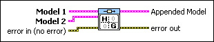 Appended Model is the augmented model this VI produces from the two input models. When the two input models are not of the same model type, the following model hierarchy determines the model type of the resulting model: state-space>transfer function>zero-pole-gain. For example, if one input is a state-space model and the other is a zero-pole-gain model, the resulting model is a state-space model. To access and modify the data in the model, use the Model Information VIs. |