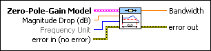 Zero-Pole-Gain Model contains a mathematical representation of and information about the system for which this VI determines bandwidth. | ||||
