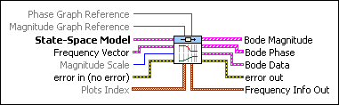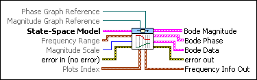 Produces the Bode magnitude and Bode phase plots of the system model on an XY graph. Wire data to the State-Space Model and Frequency Range inputs to determine the polymorphic instance to use or manually select the instance.