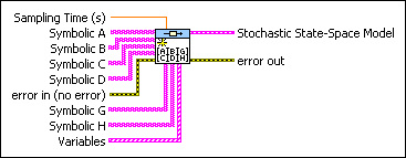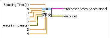 Creates a stochastic state-space representation of a system using the matrices A, B, C, D, G, and H, and the Sampling Time. This VI also produces a stochastic state-space model that specifies the data in symbolic form. Wire data to the A, B, C, D, G, or H inputs to determine the polymorphic instance to use or manually select the instance.