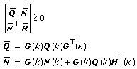 L(k) = [A(k) · P(k|k–1) · CT(k) + G(k)Q(k)HT(k) + G(k)N(k)] · [C(k) · P(k|k–1) · CT(k) + H(k)Q(k)HT(k) + H(k)N(k) + NT(k)HT(k) + R(k)]–1