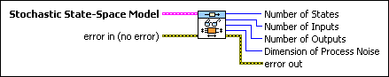 Obtains the number of states, inputs, and outputs of the stochastic state-space system model. This VI also returns the dimensions of the process noise vector w.
