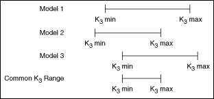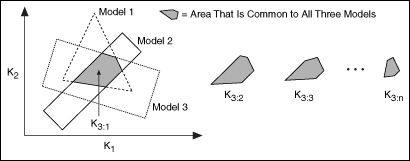- Calculates a K3 range that is feasible for all specified models. If this VI cannot calculate this range, the problem is infeasible, and LabVIEW returns an error. The following illustration shows an example of steps 1 and 2.
