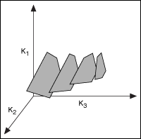 - Lines up each slice in three-dimensional space, where K3 is the third axis. This step approximates a three-dimensional shape that represents the boundary between stable and unstable sets of PID gain values. On this three-dimensional grid, K1 is the y-axis, K2 is the z-axis, and K3 is the x-axis. The following illustration shows an example of this step.