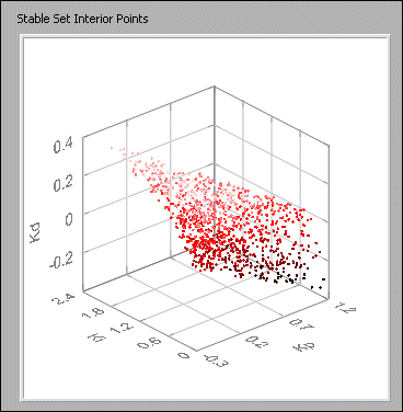 Stable Set Interior Points returns the set of gain values that lie within the Stable Set Boundary. All gain values within the stable boundary are guaranteed to be stable for the PID controller. Additionally, all gain values are guaranteed to meet any performance criteria you specified by using the Min Gain and Phase Margins parameter. | ||||||