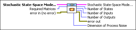 Determines if the dimensions of the stochastic state-space system matrices are consistent with each other. This VI also calculates the number of inputs, outputs, and states, as well as the dimensions of the process noise vector w.