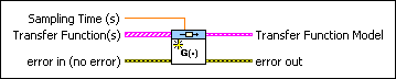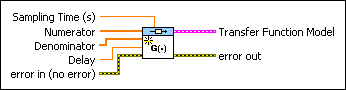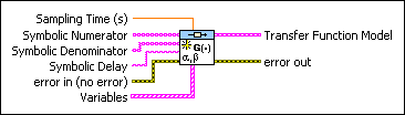 Creates a transfer function representation of a system using the Sampling Time (s), Numerator, Denominator, and Delay. This VI also produces a transfer function model which specifies the data in symbolic form. You must manually select the polymorphic instance to use.
