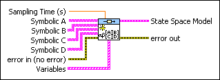 State Space Model returns the created model. The data consists of the arrays Symbolic A, Symbolic B, Symbolic C, and Symbolic D in which this VI evaluates string elements using data of the Variables array. To access and modify the data in the model, use the Model Information VIs. | ||||