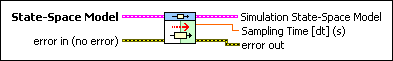 Simulation State-Space Model returns the simulation model equivalent of a control design model. You can use the resulting simulation model with the Simulation VIs and functions. |