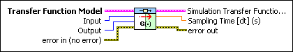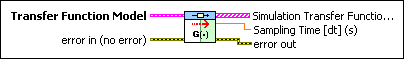 Transfer Function Model contains a mathematical representation of and information about the control design model you want to convert into a simulation model. You can use the resulting simulation model with the Simulation VIs and functions. |