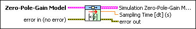 Simulation Zero-Pole-Gain Model returns the simulation model equivalent of a control design model. You can use the resulting simulation model with the Simulation VIs and functions. |