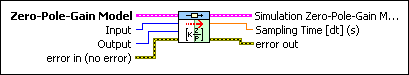 Zero-Pole-Gain Model contains a mathematical representation of and information about the control design model you want to convert into a simulation model. You can use the resulting simulation model with the Simulation VIs and functions. |