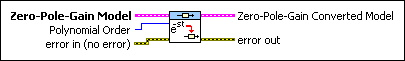 Zero-Pole-Gain Model contains a mathematical representation of and information about the continuous-time system for which this VI incorporates time delays using Pade approximation. |
