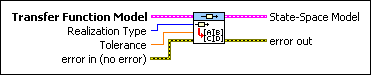 Converts a system model to state-space form. This VI produces a full or minimum realization by specifying the Realization Type. Wire data to the Transfer Function Model input to determine the polymorphic instance to use or manually select the instance.