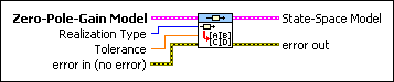 This VI converts zero-pole-gain models to transfer function models before converting a zero-pole-gain model into a state-space model.